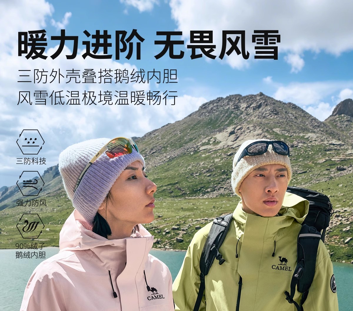 > 骆驼冲锋衣三合一羽绒服王者凯甲ICON男女新款防风防水鹅绒版外套